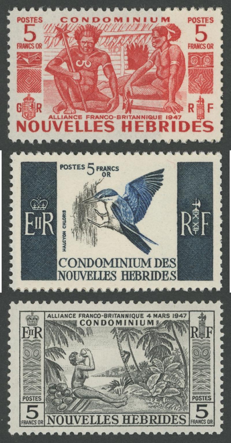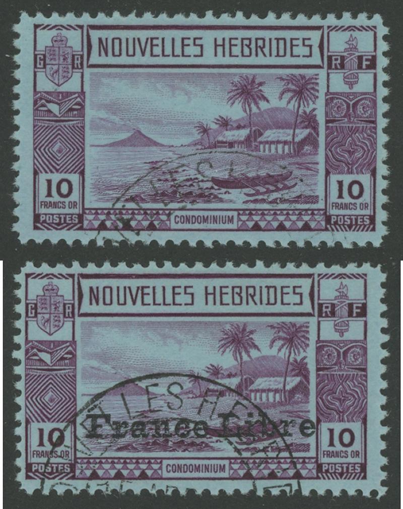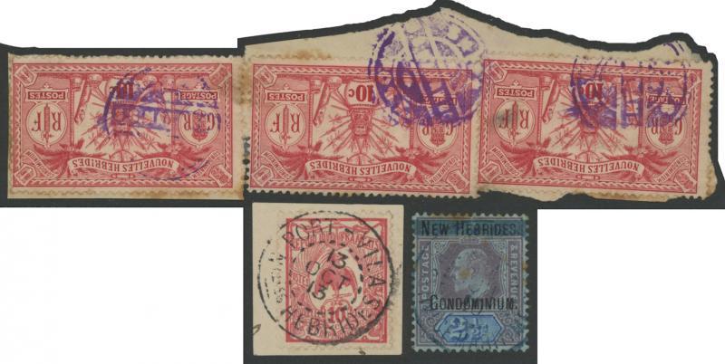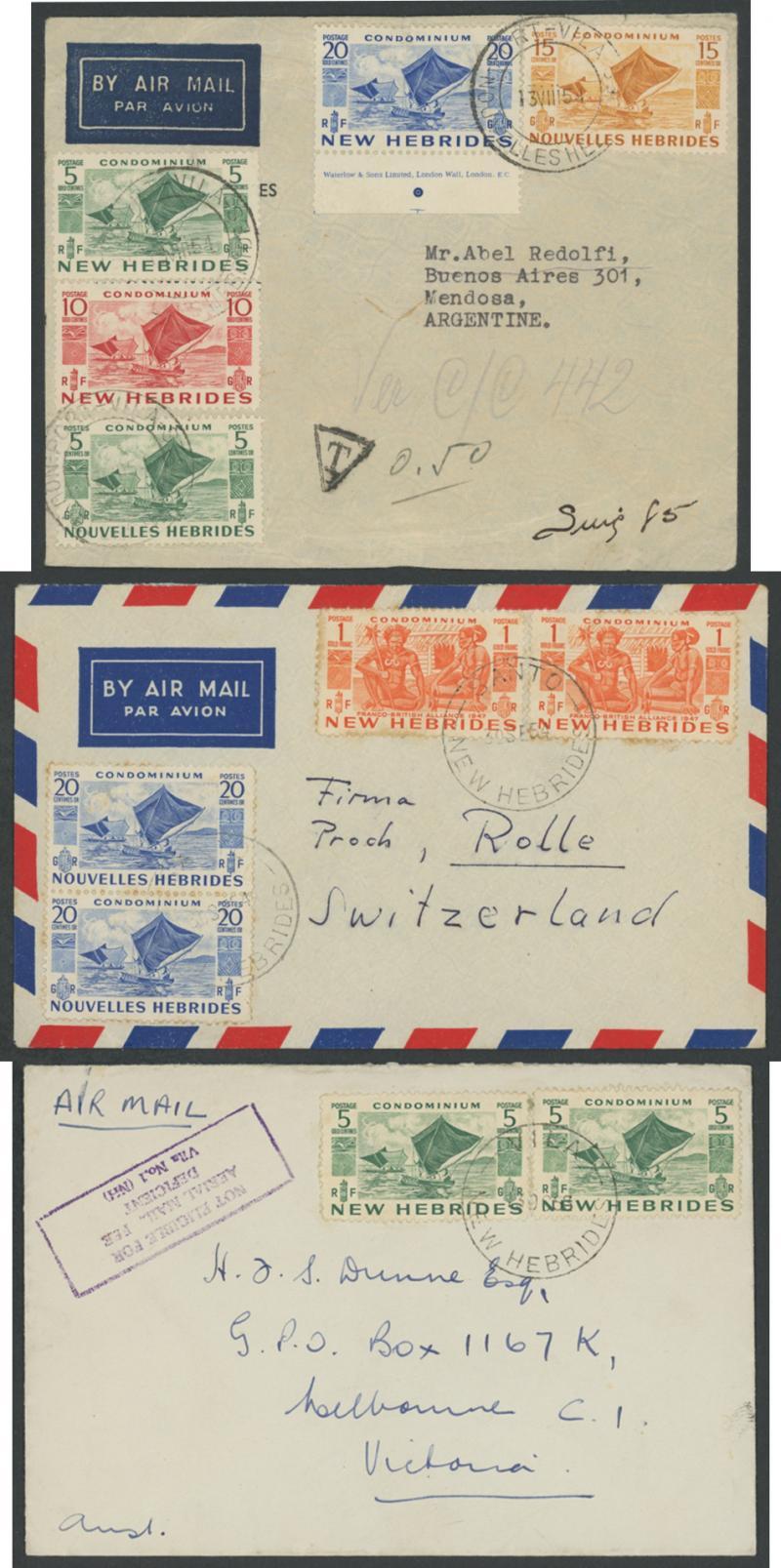 POSTAL HISTORY: Mostly 1950s-1970s commercial covers with a few mixed issue & commemorative frankings plus British/French combination frankings x12, cds including 'LAMAP', 'LOLOWAI', 'MELSISI', 'NORSUP', 'TANNA' & 'TONGOA', registered x6 including with Australian-pattern R labels of 'LAMAP' & 'SANTO' x2 plus Avis de Reception cards x3, a few with company imprints, many airmails including inter-island services and to Argentina (underpaid & taxed), Cameroun, Canada x2, Fiji, Finland, Guadeloupe (to a ship's passenger with crude 'NON A BORD' label), Holland, Solomons x5, Sweden and Tahiti x2, also to Victoria with boxed 'NOT ELIGIBLE FOR/AERIAL MAIL. FEE/DEFICIENT/Vila No 1 (NH)' cachet (not recorded by Ted Proud) and to USA underpaid & taxed, Aerogrammes x7 unused/CTO, a few inwards items, generally fine to very fine. A very good lot.