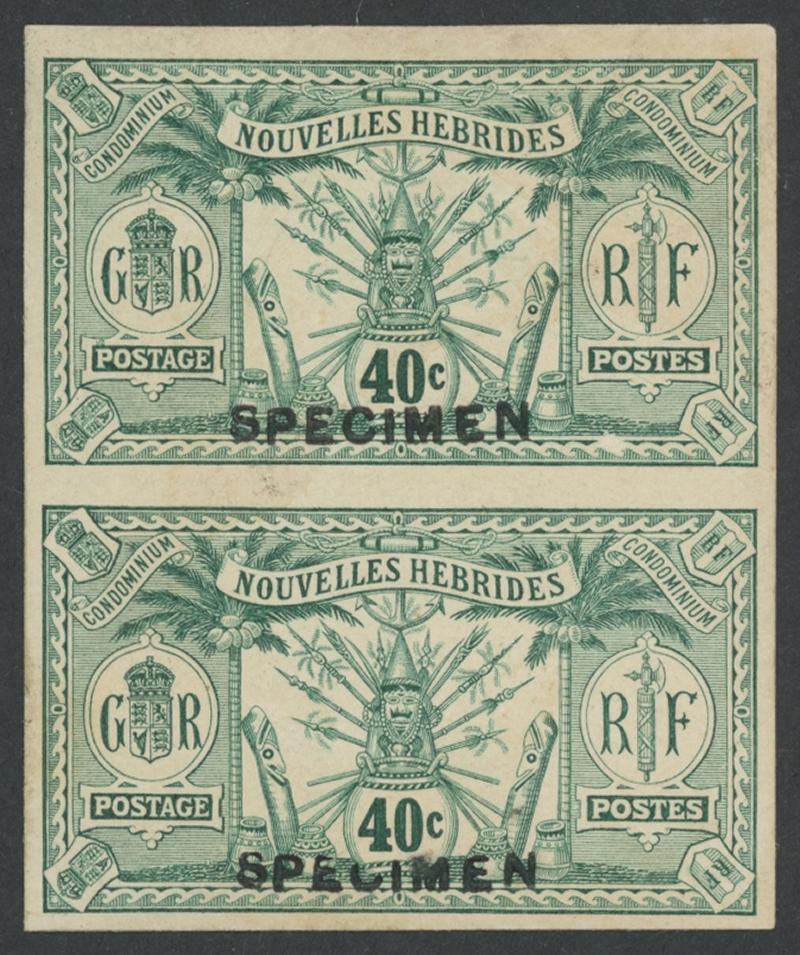 FRENCH: 1911 Idol & Weapons 40c imperf proof in blue-green on gummed unwatermarked paper vertical pair overprinted 'SPECIMEN' (defective overprint on the the lower unit), margins good to large, adhesion (presumably from an archival page) on the reverse. (Image1)