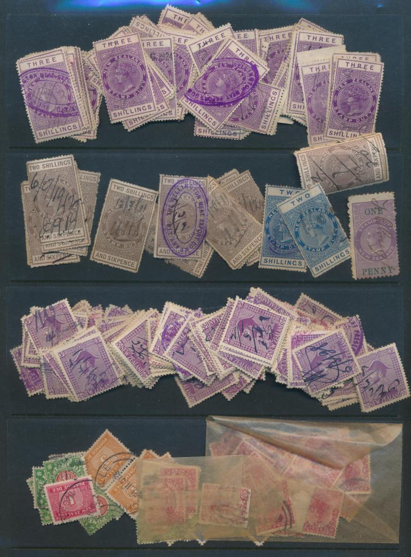 Pre-WWII accumulation including 1906 Christchurch Exhibition set * plus publicity labels x4, used on pages from QV First Sidefaces 2d x30+, Newspaper ½d x30+, Second Sidefaces, 1898 Pictorials, 1d Universals & Dominions, KGV Heads low values with potential numeral & datestamp postmark interest, also WWI Poverty Bay ½d War Seal (minor faults), Railway Newspaper Stamps, Revenues noted QV 1867 1/- imperf, 2/-, 3/-, 5/- & 7/- perf, QV Postal Fiscals to 10/-, etc, also a few more modern & a couple of pages of Australian Colonies, condition quite variable but well worth a look.