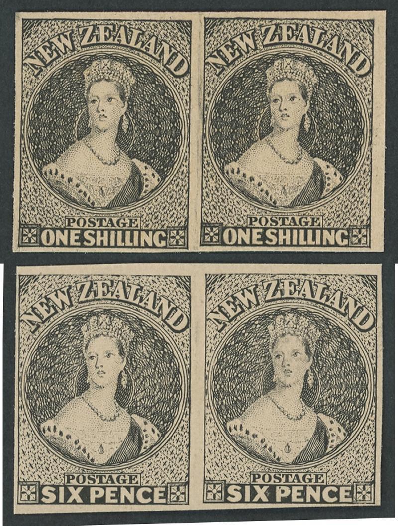 1855-73 QV Chalons Hausberg reprinted imperforate plate proofs 3d, 4d, 6d & 1/- all in black on thin card in matching horizontal pairs, very fine impressions, margins close to large.