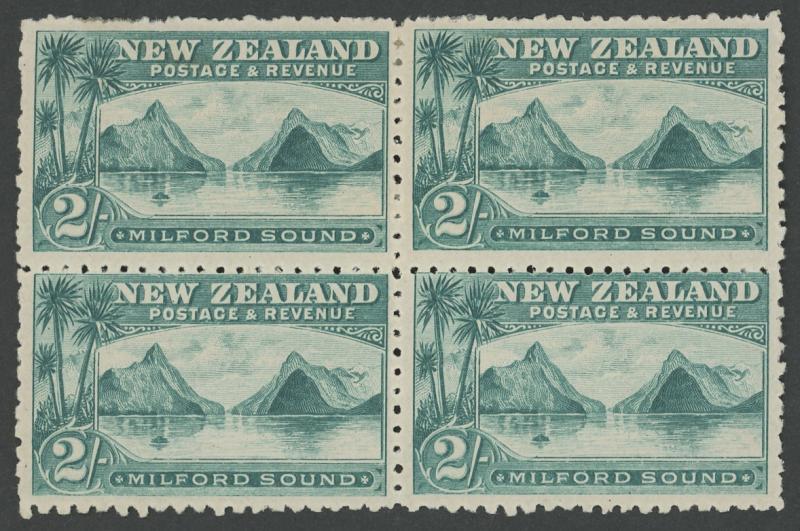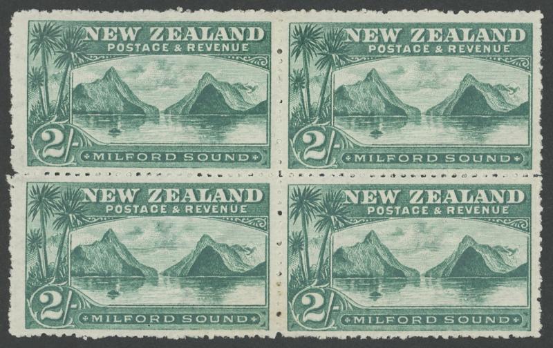 1902-07 Pictorials Cowan Paper NZ/Star Single Watermark Perf 14 2/- green SG 328 block of 4, fresh colour, well-centred, characteristic rough perfs, the upper units with a tiny hinge remainder, the lower units with minor gum disturbances, Cat £1000+ for singles. (Image1)