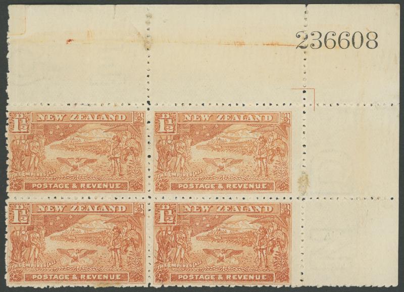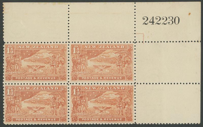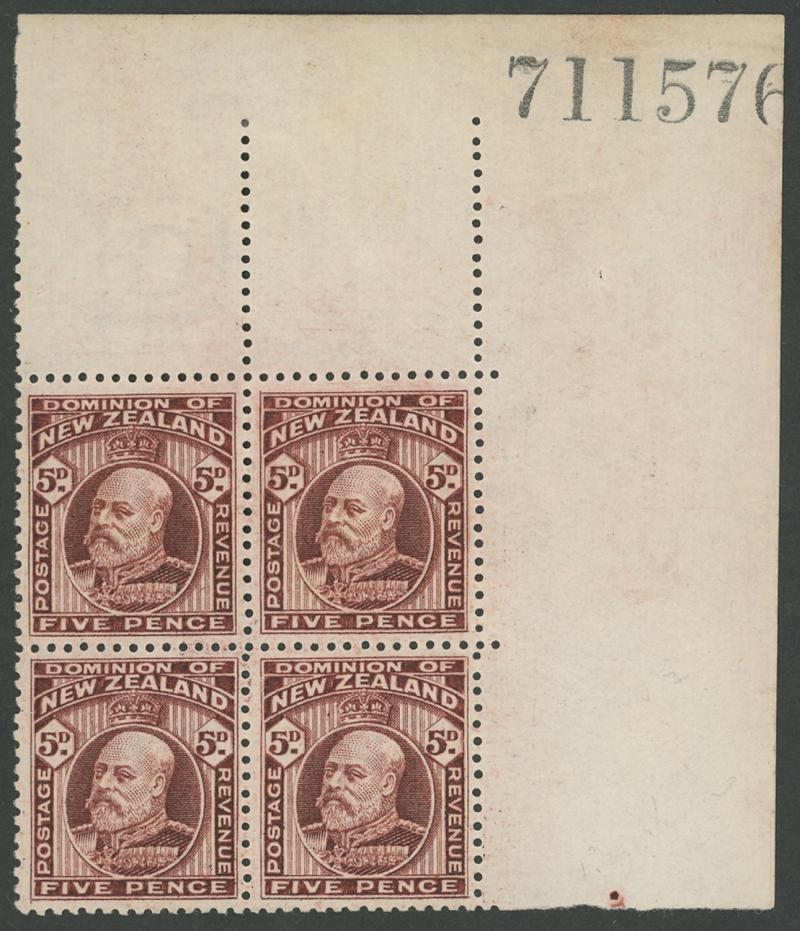 1909-16 KEVII Heads Comb Perf 14x13½ 5d red-brown SG 402 (CP H5c2) block of 4 from the upper-right corner of the sheet with rare Plate Dot in the margin opposite the lower frame of the units in the second row and Sheet Number '711576' in black at upper-right, fresh colour, well-centred, unmounted, Cat £80+ for mounted (NZ$800+ for unmounted) singles. C&P don't list the Plate Dot. Sold at Auckland City Stamps in 2022 for NZ$1800. (Image1)