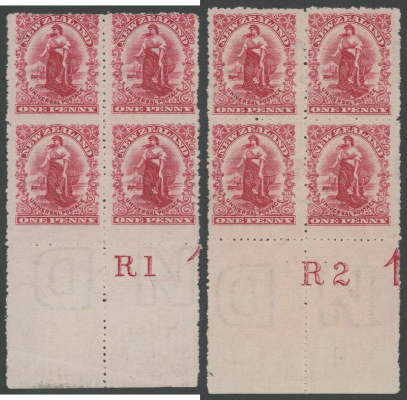 1906 Penny Universal Single-Lined Star 'NZ' Watermark Royle Plates Perf 14 1d rose-carmine CP G10a(1) (SG 356) blocks of 4 from the base of the sheet with Plate Number 'R 1' and Arrow and with Plate Number 'R 2' and Arrow in the margin below the lower-right units CP G10a[4], characteristic rough perfs & wayward centring, each with the upper units lightly mounted and the lower units including the Plate Number single unmounted, Cat NZ$2120+ for the Plate Number singles mounted, four mounted & two unmounted singles. (2 blocks) (Image1)