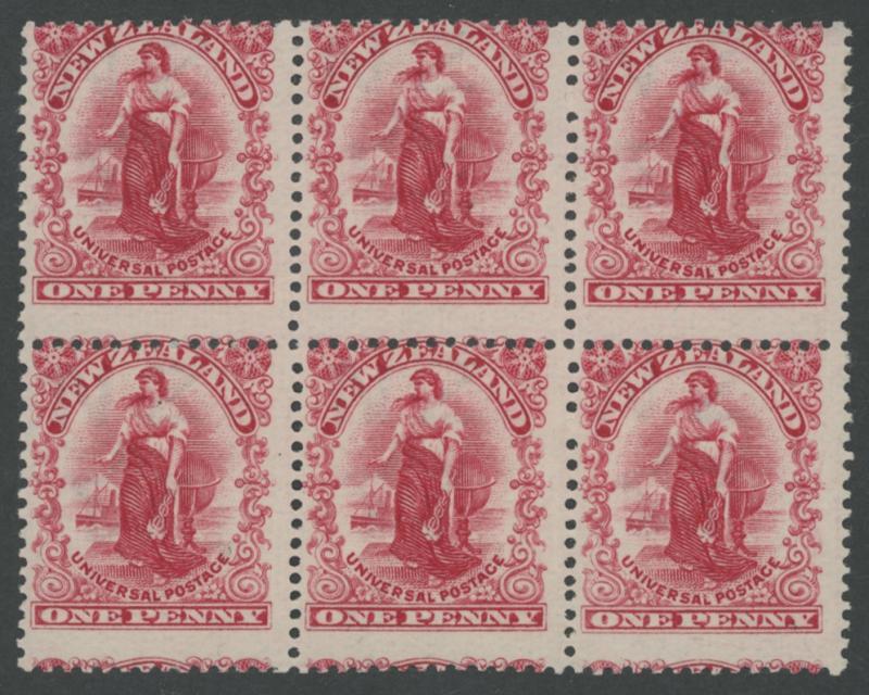 1906 Penny Universal Single-Lined Star 'NZ' Watermark Royle Plates Comb Perf 14x14½ 1d bright rose-carmine CP G10f (SG 360) block of 6 (3x2), misplaced perfs into the units below, the outside upper units with small hinge remainders, the central upper unit unmounted but with a tiny gum disturbance, the lower units unmounted, Cat NZ$2250+ (£600+) for mounted singles. (Image1)