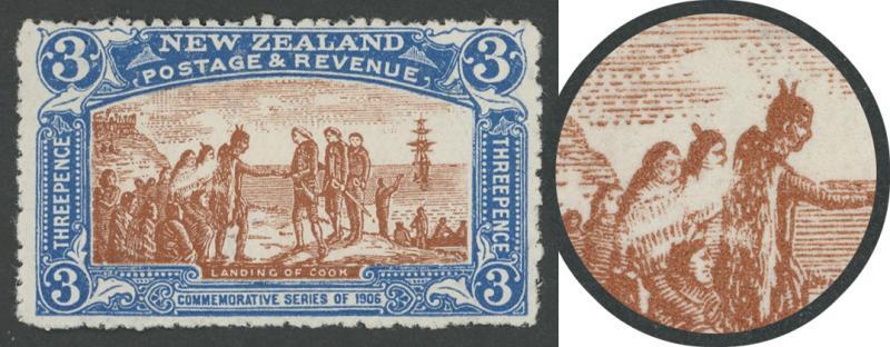 1906 Christchurch Exhibition NZ/Star Single Watermark 3d Captain Cook's Landing with the Watermark Sideways Inverted SG 372a (Cat £450+) additionally with White Flaw on Chief's Back CP S3aY & Z, well-centred, characteristic rough 'fluffy' perfs, small hinge remainder, Cat NZ$1050+. RPSL Certificate (2024) confusingly states "watermark sideways but variety reversed". Ex Robin Gwynn. (Image1)