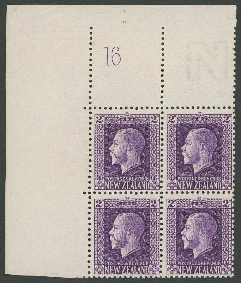 1915-33 KGV Heads Cowan Unsurfaced Paper Perf 14x13½ 2d violet SG 417 block of 4 from the upper-left corner of the sheet with Plate Number '16' at top CP K2a[4], a couple of light creases at the very top of the margin otherwise very fine, unmounted, Cat NZ$800+ for a mounted block. Ex George Branam: sold in 2022 for NZ$730. (Image1)