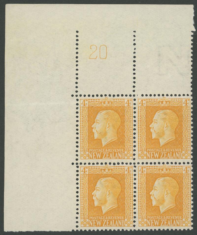 1915-33 KGV Heads Cowan Unsurfaced Paper Perf 14x13½ 4d yellow SG 421 block of 4 from the upper-left corner of the sheet with Plate Number '20' at top CP K5a[4], very fine, unmounted, Cat NZ$600+ for mounted. Sold at Auckland City Stamps in 2022 for NZ$365. (Image1)