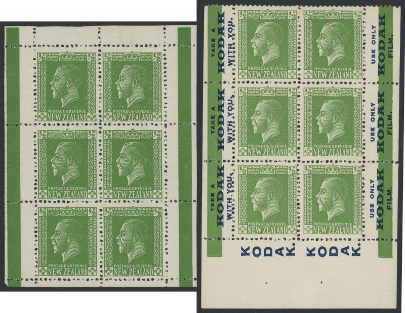 1915-33 KGV Heads Jones Chalk-Surfaced Paper Perf 14x15 ½d green booklet pane of 6 (2x3) with bars on selvedge SG 441a, one unit with small hinge remainder, the other units unmounted, plus Cowan Thick Opaque Chalk-Surfaced Paper ½d green booklet pane of 6 (2x3) with bars & advertising on selvedge SG 446a for 'KODAK' camera & film in blue, unmounted, Cat £340+ for mounted. (2 panes) (Image1)