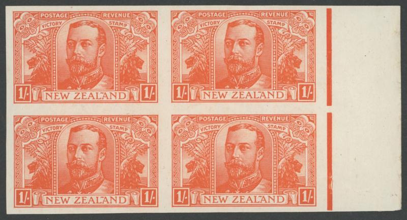 1909-27 Penny Dominion De La Rue Paper with Toned Gum NZ/Star Single Watermark Sideways 1d carmine Imperforate block of 4 SG 408b (CP J1aT), the upper units with Partly Duplicated Top Frames, good mostly even margins, a couple of minor gum bends, unmounted, Cat £700+ (NZ$2000+) for mounted pairs. (Image1)
