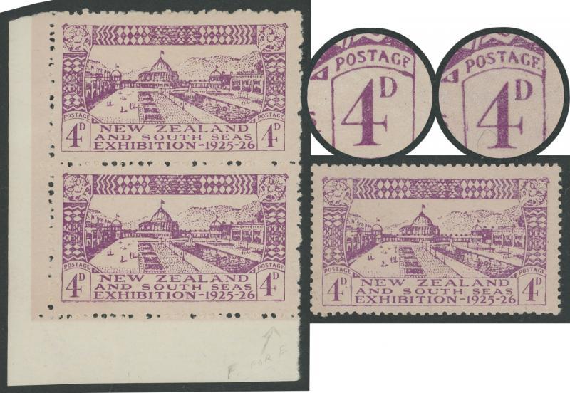 1925 Dunedin Exhibition ½d yellow-green/green, 1d carmine/rose & 4d mauve/pale mauve set SG 463-465 mint & used plus 4d with 'POSTAGF' at Right SG 465a in a vertical pair, and 4d with 'POSTAGF.' (with Full Stop) CP S17cX & Z, the two variety units unmounted, Cat £418+ for mounted/used singles (CP NZ$675+ plus unmounted premium for the varieties). Gibbons mention but don't price the latter flaw in a footnote: we have priced it as SG 465a.