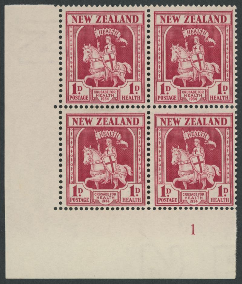 1934 Health Crusader 1d+1d carmine SG 555 block of 4 from the lower-left corner of the sheet with Plate Number '1' in the lower margin CP T6a[4], unmounted, Cat NZ$500+. (Image1)