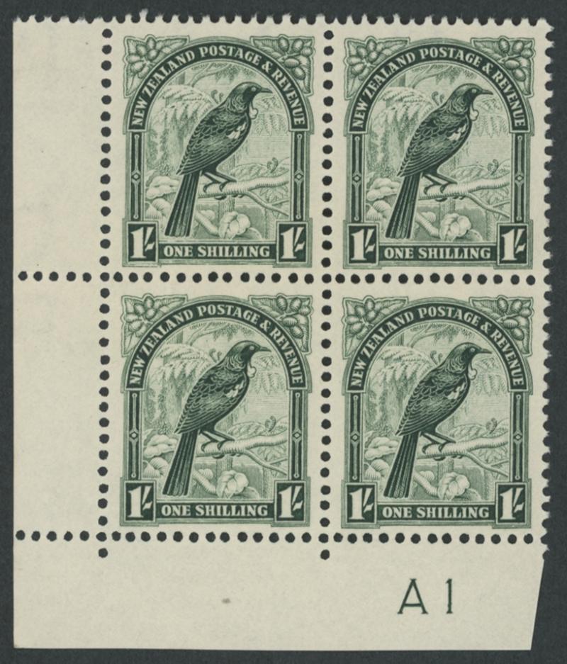 1935-36 Pictorials NZ/Star Single Watermark Perf 14x13½ Tui Parson Bird 1/- deep green SG 567 block of 4 from the lower-left corner of the sheet with Plate Number 'A1' in the lower margin CP L12a[4], unmounted, Cat NZ$800. (Image1)