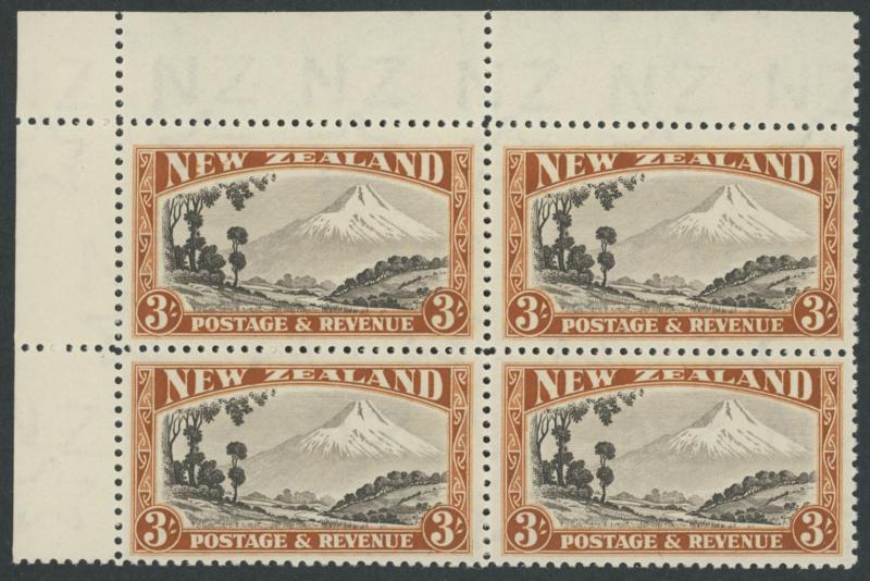 1936-42 Pictorials NZ/Star Multiple Watermark Perf 12½ Mount Egmont 3/- sepia & chestnut SG 590b (CP L14e) marginal block of 4 from the upper-left corner of the sheet, generally well-centred, unmounted, Cat £340+ (NZ$600+) for singles. (Image1)