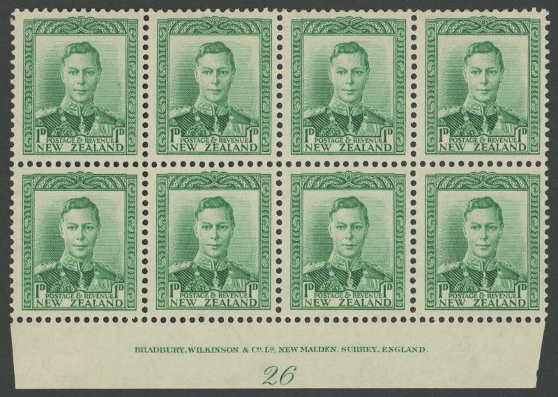 1938-44 KGVI Heads NZ/Star Multiple Watermark 1d green SG 606 Bradbury Wilkinson Imprint block of 8 (4x2) with Plate Number '26' CP M2c(8), the upper units lightly mounted or with small hinge remainders, the lower units unmounted, Cat NZ$3750. Campbell Patterson states that "Plate 26 in green is very rare and the suggestion is that this plate was used to print trial sheets in green before the green colour was approved as the right replacement for the earlier scarlet. Probably less than a dozen plate blocks of Plate 26 in green exist". Ex Robin Gwynn. (Image1)