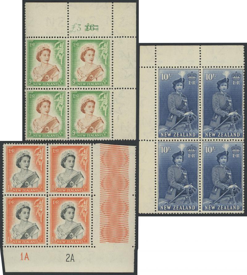 1953-59 QEII Definitives set to 1/9d SG 723-733b Plate Number blocks of 4 plus additional blocks of 4 or larger with all-different plate numbers, De La Rue Imprints or Value Imprints noted 3d plate numbers complete including Die 1b '32' & '33', 9d with '£6' obliterated and replaced by '£3', 1/6d & 1/9d plate number blocks with burelé decorations in the margin, 1/9d Thin Paper imprint block of 4 & plate number block of 8 (2x4) with Retouch and 1/9d Thick White Paper imprint block of 4 & plate number block of 4 with Retouch, also 2/6d brown Value Imprint blocks of 4 x2, 3/- green Value Imprint block of 4 & 10/- marginal block of 4 plus booklet panes 1d orange x6 & 3d vermilion x5, some with minor blemishes but generally very fine unmounted, Cat NZ$2400+.
