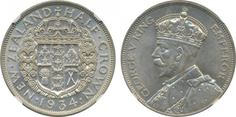 HALF-CROWN: 1934 KGV 2/6d KM 5, in NGC holder graded 'MS64', Cat NZ$850. (Image1)