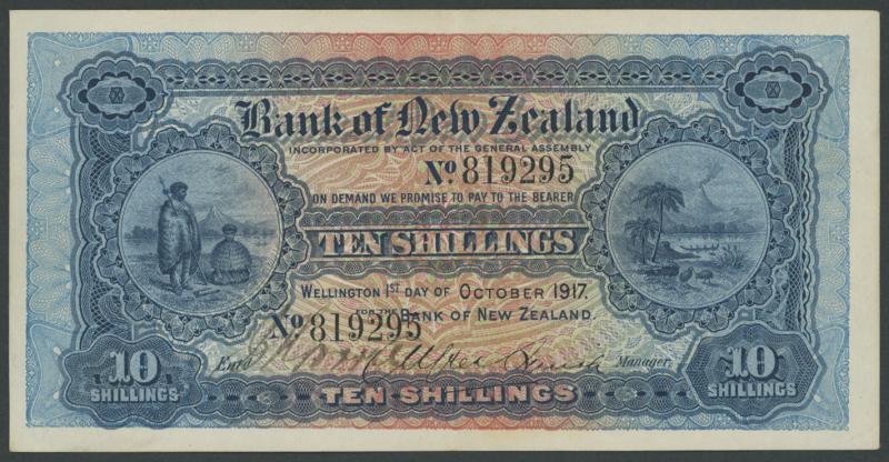 Bank of New Zealand 1917 10/- blue and pink Pick S223a domicile Wellington 'October 1917', Without Serial Prefix '819295', manuscript signature, three vertical folds, VF. Rare. (Image1)