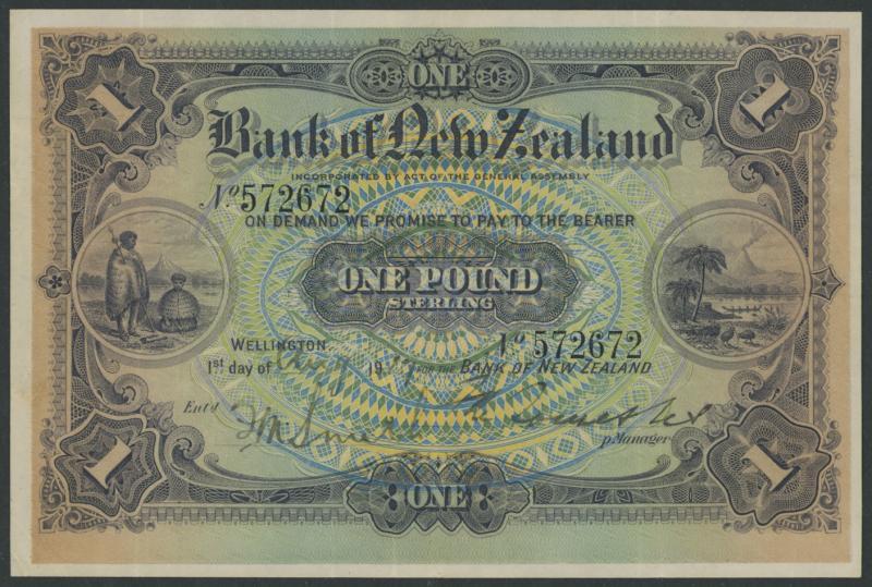 Bank of New Zealand 1917 £1 (as Pick S225 with manuscript date) domiciled Wellington '1st day of aug 1917' manuscript signatures and date, serial '572672', light vertical creases, VF. Very scarce. (Image1)