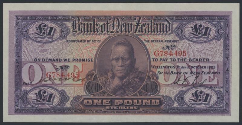 Bank of New Zealand 1929 £1 violet Reid (manager) Pick S234a domiciled Wellington 'October 1929', serial 'G784,495' in red, manuscript signature at left, light vertical bends, gVF/aEF. Very scarce. (Image1)