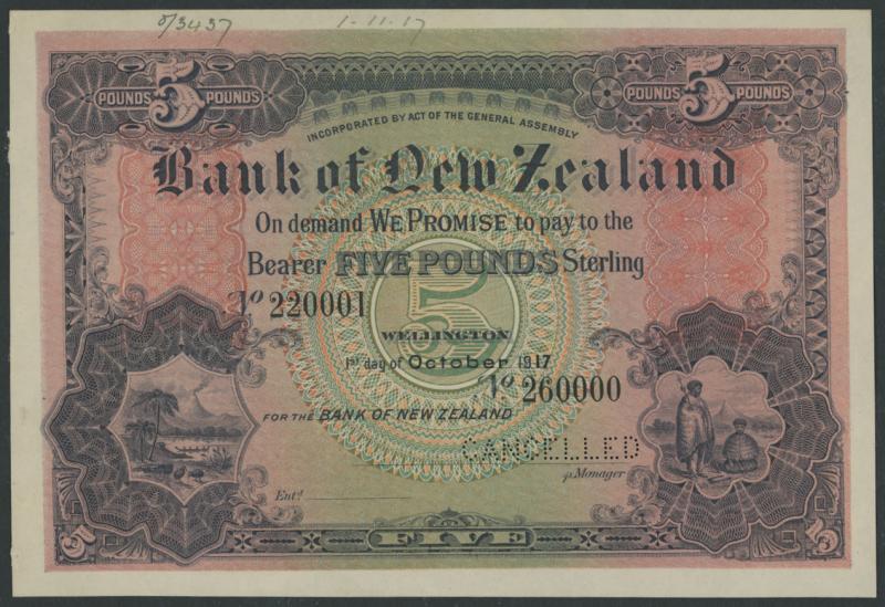 Bank of New Zealand 1917 £5 (as Pick S227) printers record proof note domiciled Wellington '1st day of October 1917', manuscript '073457 1.11.17' at top, serials '220001'-'260000', perforated 'CANCELLED', aEF. (Image1)