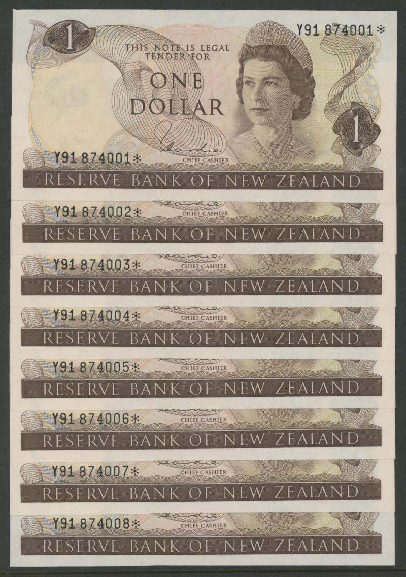 $1 1977-81 Hardie Type I P163d Star Replacement run of eight serials 'Y91 874001*'-'408*', very light edge aging, Uncirculated, Cat NZ$400.