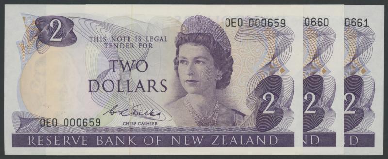 $2 1968-75 Wilks P164bF Low numbered First Prefix run of three serials 'OEO 000659'-'661', Uncirculated, Cat NZ$450. (3) (Image1)