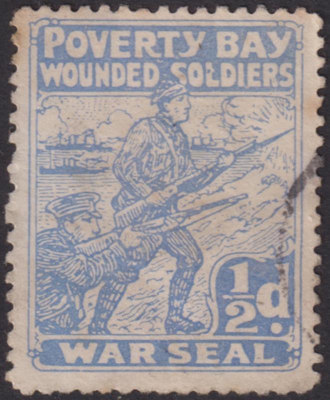 1915 ½d Poverty Bay Wounded Soldiers Fund (soldier with rifle) perforated label, pale blue. Heslop (2002). Cat $35. (Image)