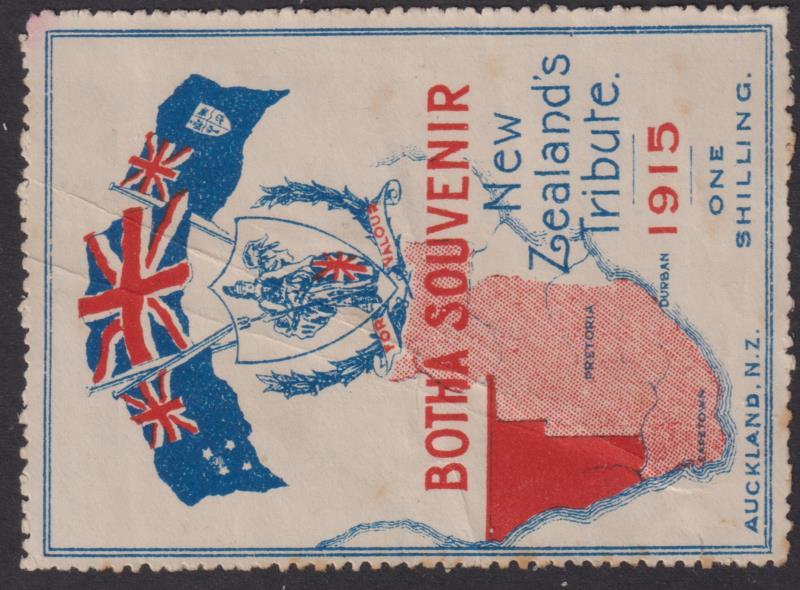 1915 1/- Botha Souvenir perforated label. NZ's tribute showing flags & S Africa map. Light toning on reverse and light diagonal crease, fine appearance. Heslop J15. Cat $250. (Image)