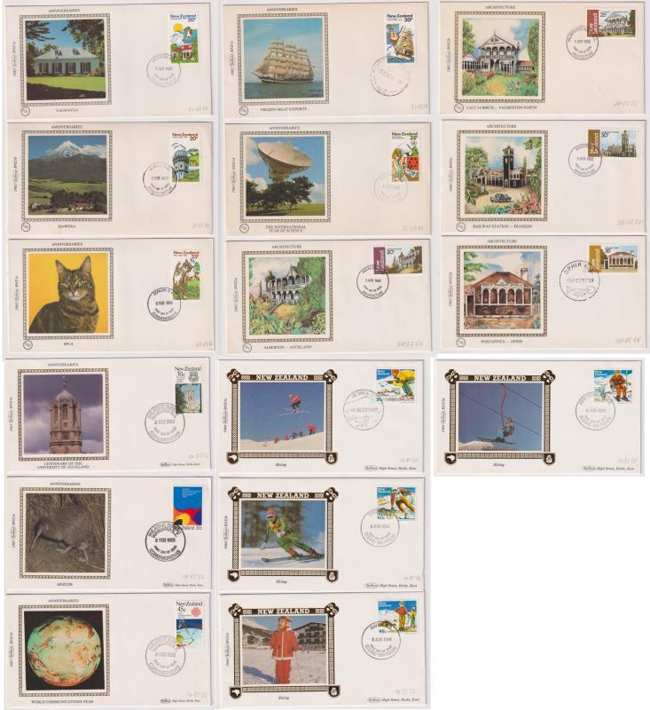 1982-4 seln of 16 diff unaddressed Benham silk FDCs. Incl 1982 commems set of 5 FDCs & 1982 Architecture set of 4 FDCs. Jury cat $74+. (Image)