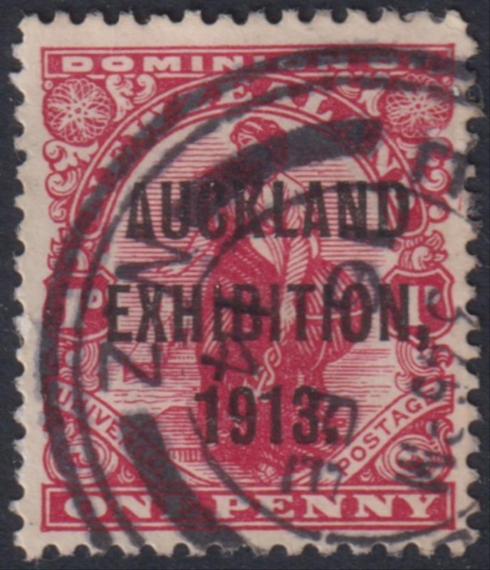 1913 1d Auckland Exbn, w/c, firm but crisp cds (unusual, not Exbn pmk). Jury cat $60. GU. (Image)