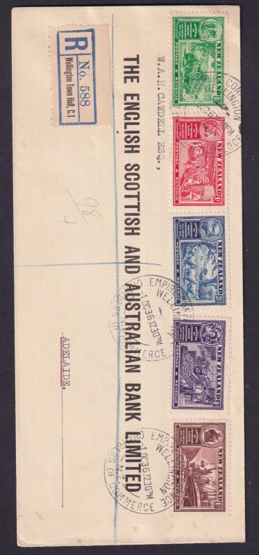 1936 Commerce reg'd plain FDC (long) with printed bank address (to Adelaide, Sth Australia), neatly franked ½d-6d set of 5, canc 3 strikes of special commem Wellington cds 1 OC 36, & with printed Town Hall regn label. Very fine. Jury cat $85. (Image)