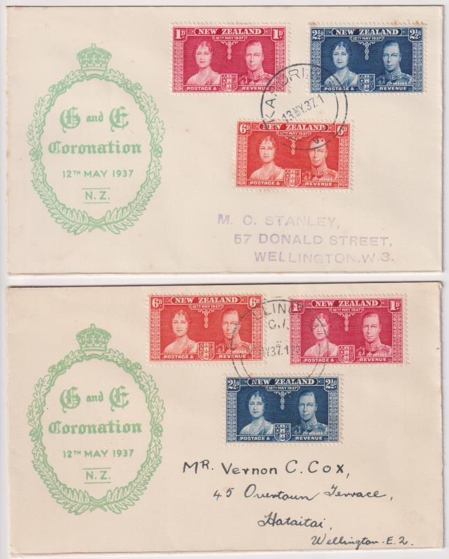 1937 Coronation printed pictorial commem FDC (crowned wreath & "G & E Coronation 12th May 1937 NZ."), light green. Two examples in diff shades of green, each franked 1d-6d set, canc Karori or Wellington cds 13 MY 37 (1 with minor tone, otherwise fine). Ex Horrell. Jones C37.1M(1). Scarcity 3. (Image)
