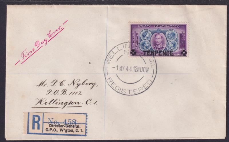 1944 10d on 1½d Centennial, plain FDC with m/s address (black) & "First Day Cover" (red) in superb "copperplate" handwriting. Stamp canc fine Wellington/Registered cds 1 MY 44. Very fine. Ex Horrell. (Image)
