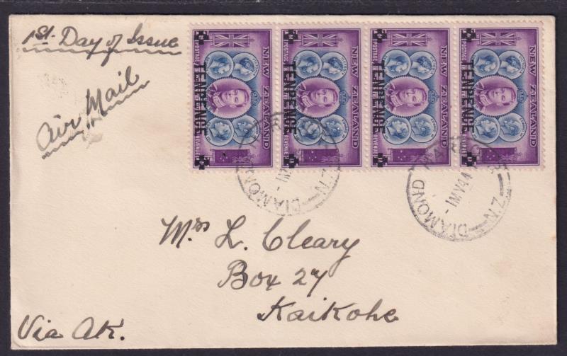 1944 10d on 1½d Centennial plain FDC, franked vert strip of 4 (sideways), canc Diamond Harbour cds 1 MY 44. Unusual. Very fine. Ex Horrell. (Image)