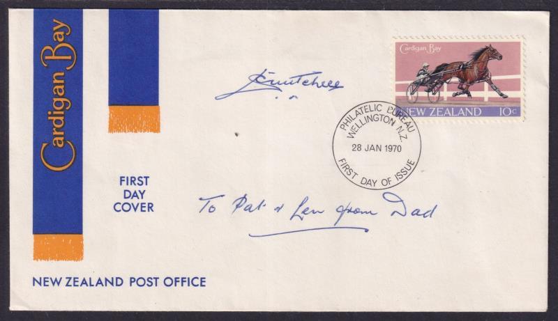 1970 10c Cardigan Bay, NZ PO FDC signed by stamp designer (LC Mitchell). Also annotated "to Pat & Len from Dad''. (Image)
