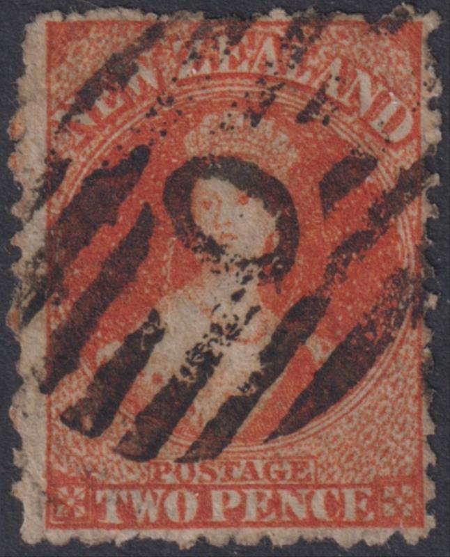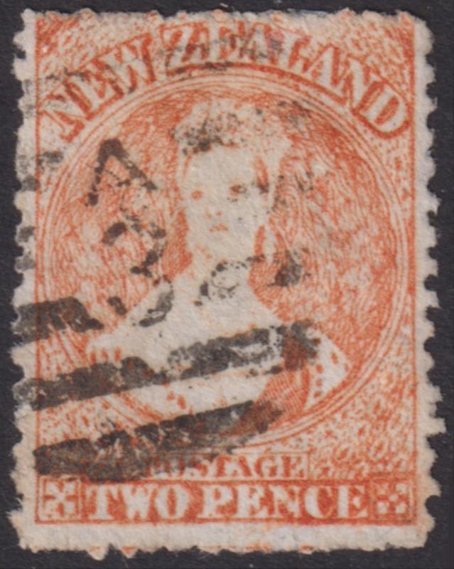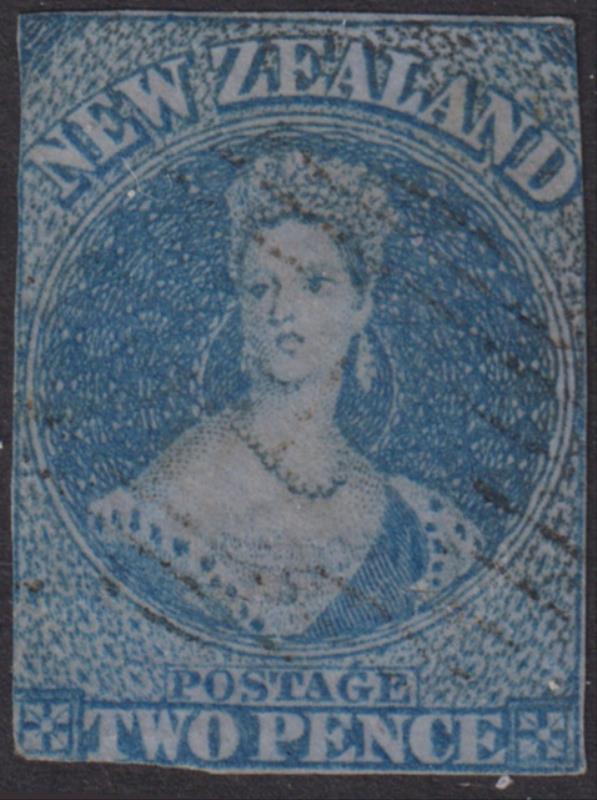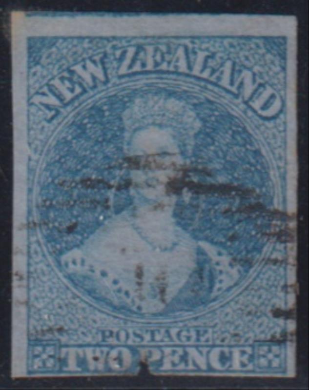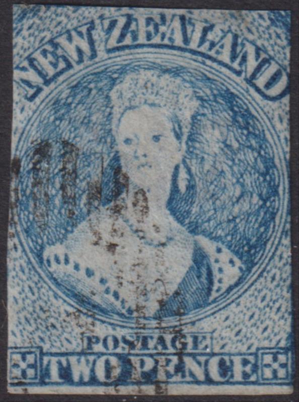 FFQ Chalon 2d pale blue, imperf 1 margin, NZ wmk, barred cancel, face clear. SG 98. Cat £350. FU. (Image)