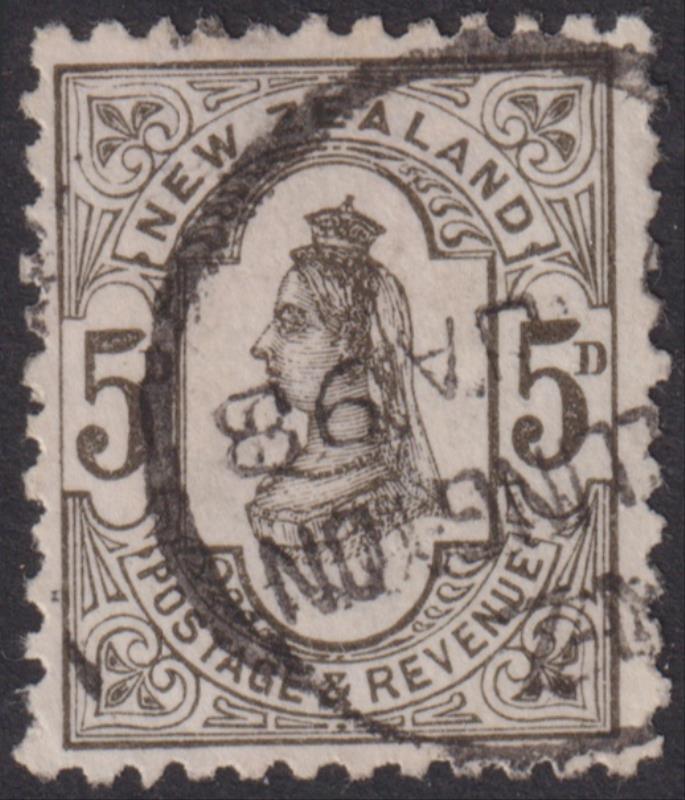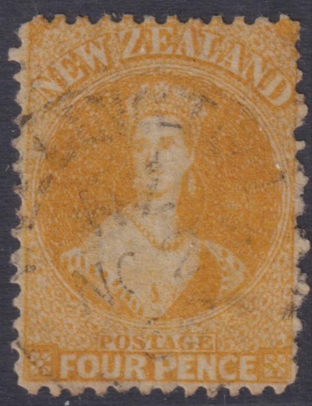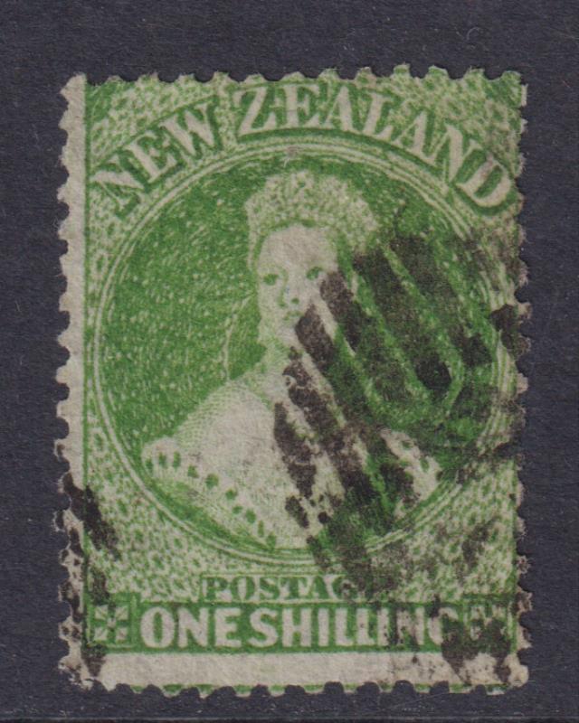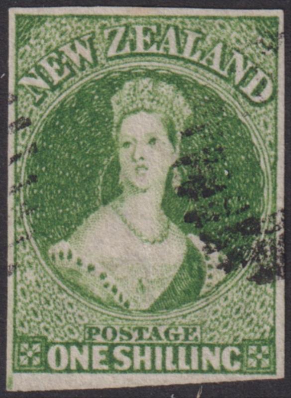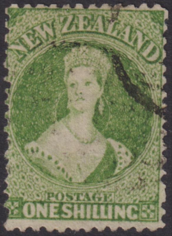 FFQ Chalon 1/- yellow-green, p13 at Dunedin, star wmk. Rather heavy Otago district obliterator cancel ("06"?). Unusually thin paper. SG 80. Cat £500. GU. (Image)