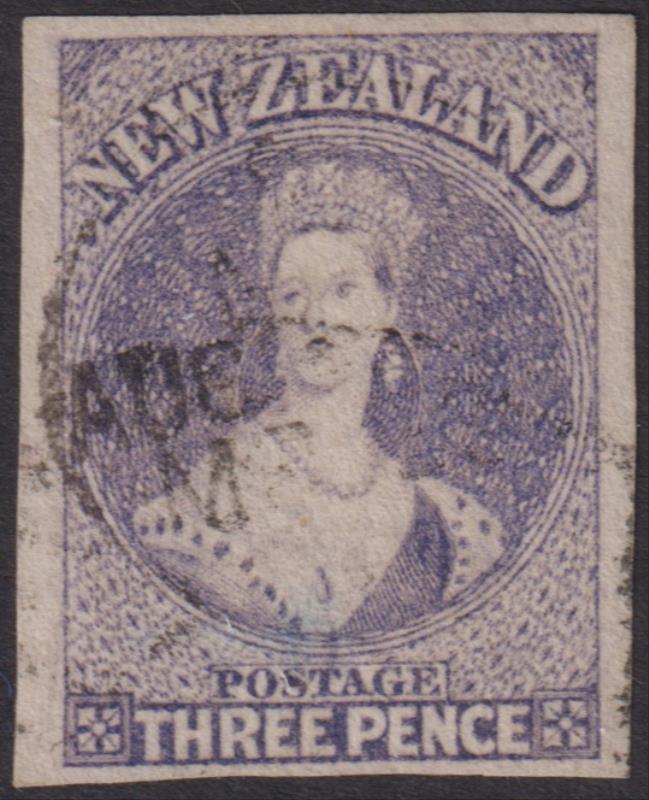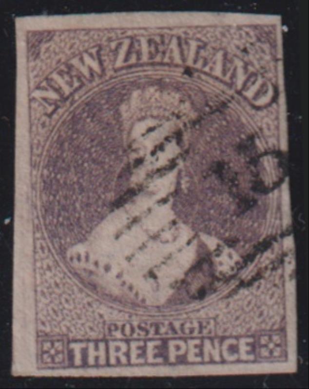 FFQ Chalon 3d lilac, accidental imperf, 4 large margins, star wmk. Closed tear at right. Worn barred "15" cancel (Nelson), cert mark on back. CP A3dT. Cat $1500. GU/FU. (Image)