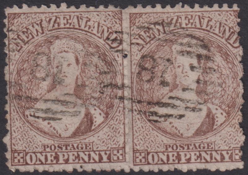 1893 1d SSF horiz pair, p10, advts Use Kaitangata & Universal, 2nd setting in red-brown (positions 2 & 3), ALFREDTON 17 JL 94 "A" class cds. Wooders 5. FU. (Image)