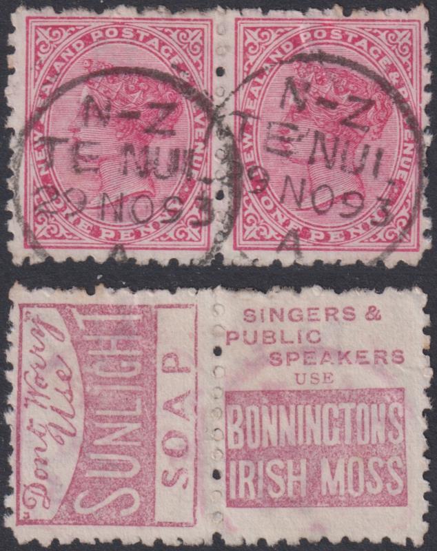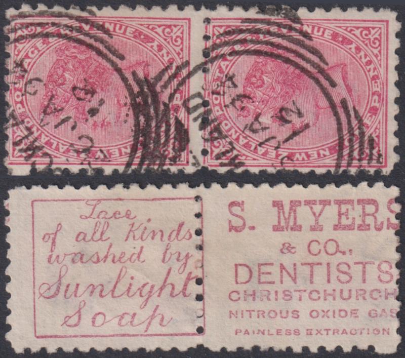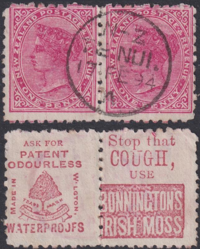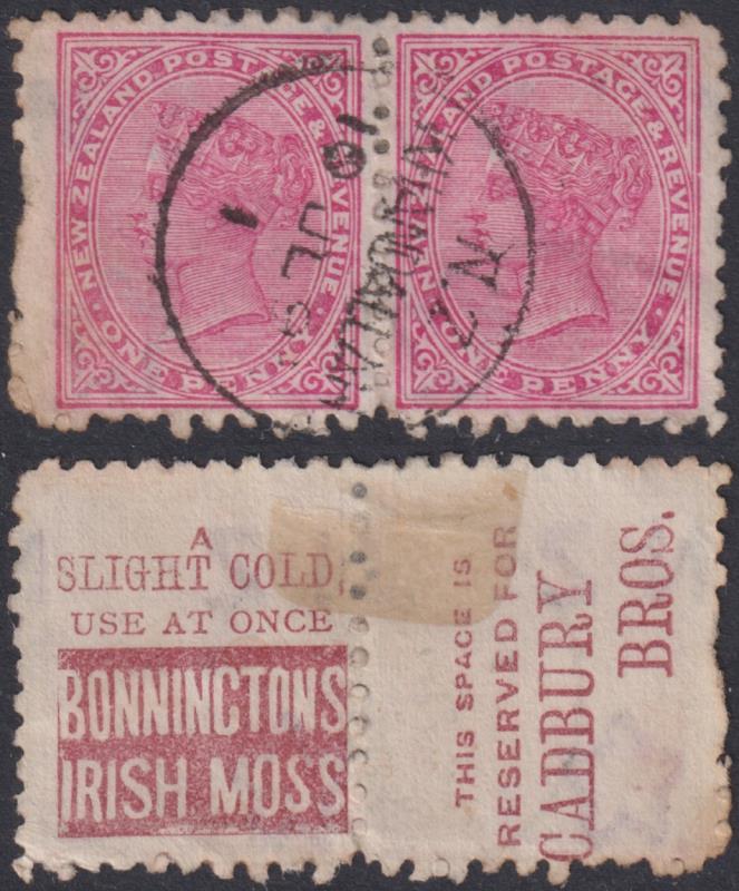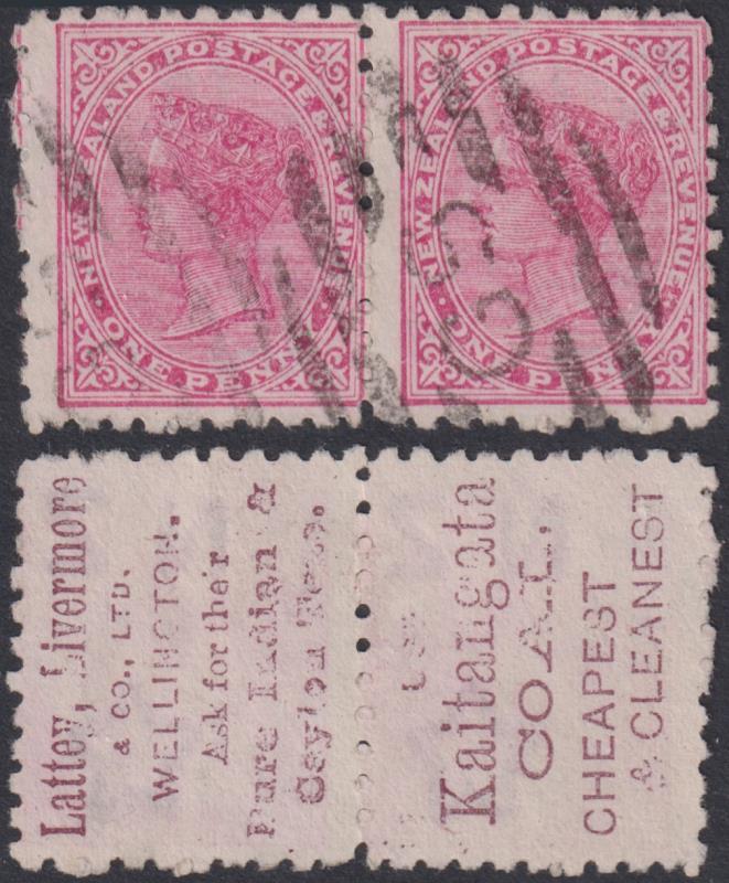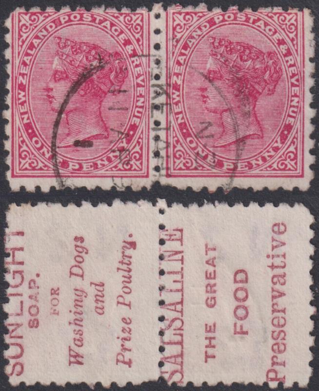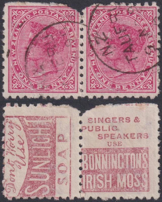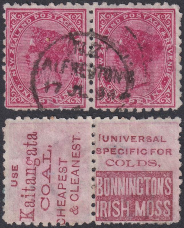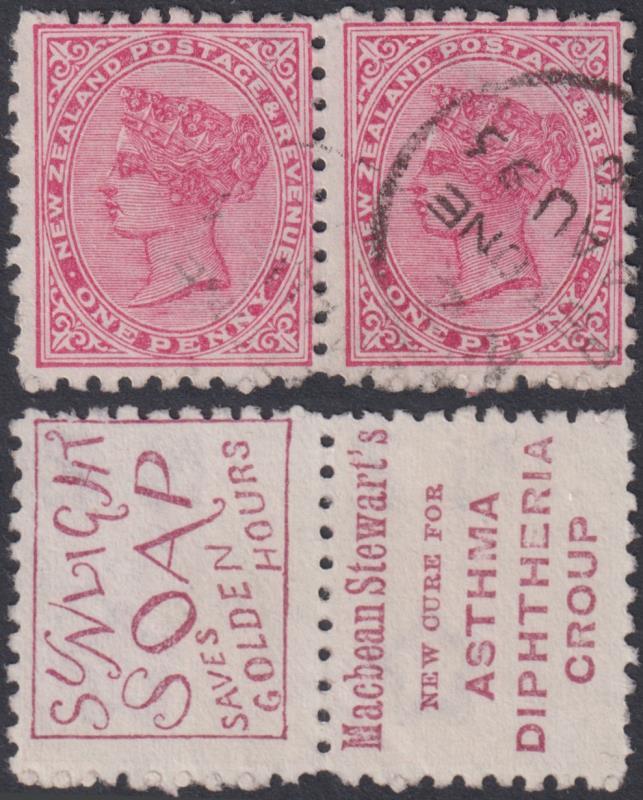 1893 1d SSF horiz pair, p10, advts Ask For & Stop That, 2nd setting in red (positions 89 & 90), TE NUI 17 FE 94 "A" class cds. FU. (Image)