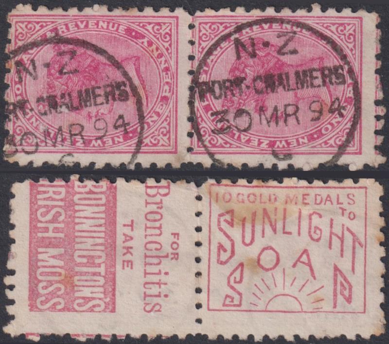 1893 1d SSF vert pair, p10, advts 10 Gold Medals & For Bronchitis, 2nd setting in red-brown (positions 56 & 68), PORT CHALMERS 30 MR 94 "A" class cds x 2. FU. (Image)