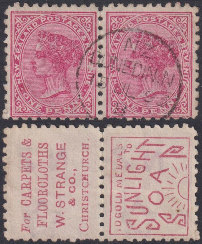 1893 1d SSF horiz pair, p10, advts For Carpets & 10 Gold Medals, 2nd setting in red (positions 55 & 56), DUNEDIN N 15 JL 93 "A" class cds. VFU. (Image)