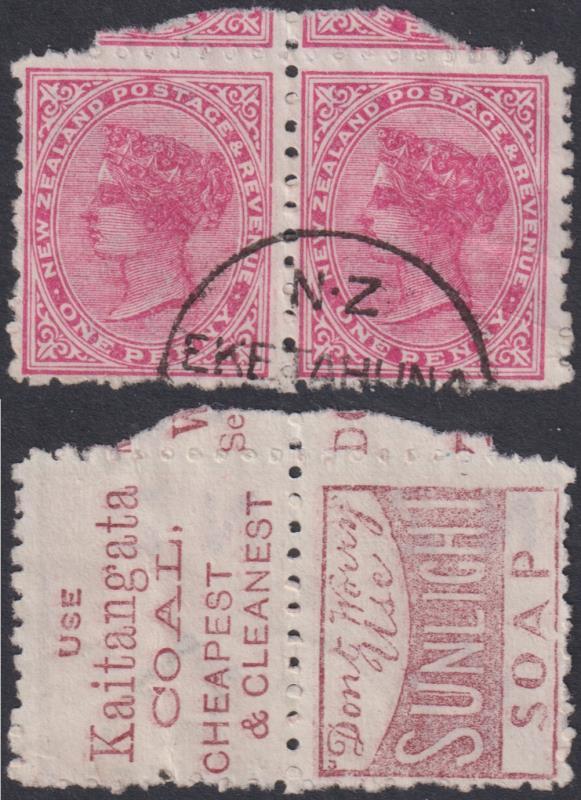 1893 1d SSF horiz pair, p10, advts Use Kaitangata & Don't Worry, 2nd setting in red-brown (positions 151 & 152), part EKETAHUNA "A" class cds. FU. (Image)