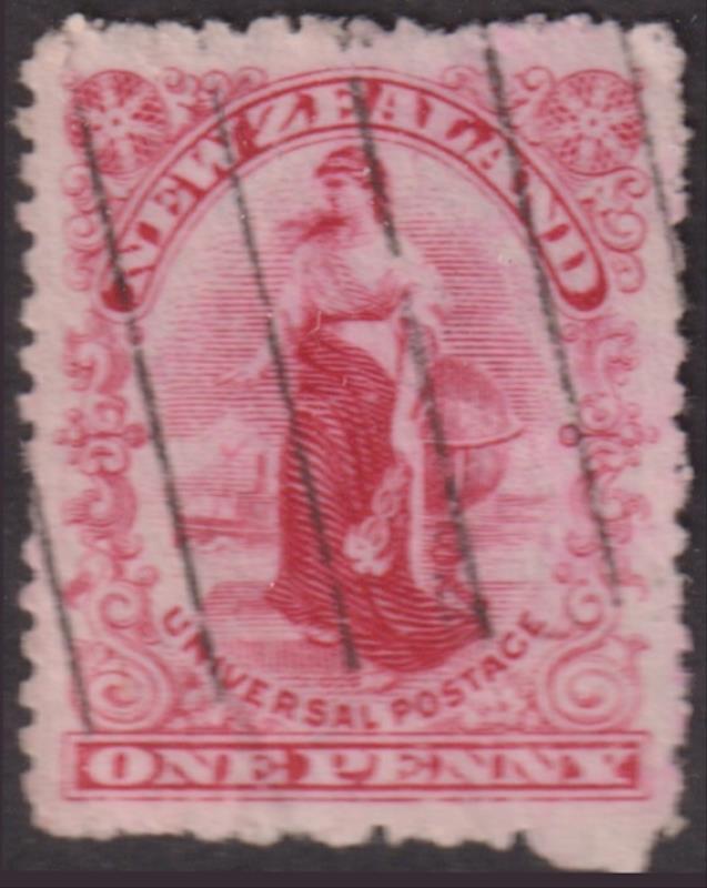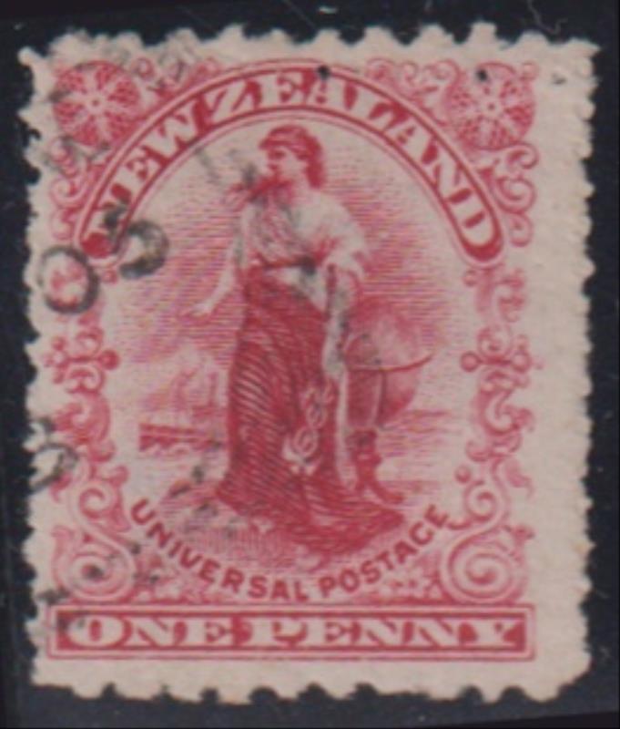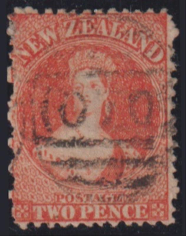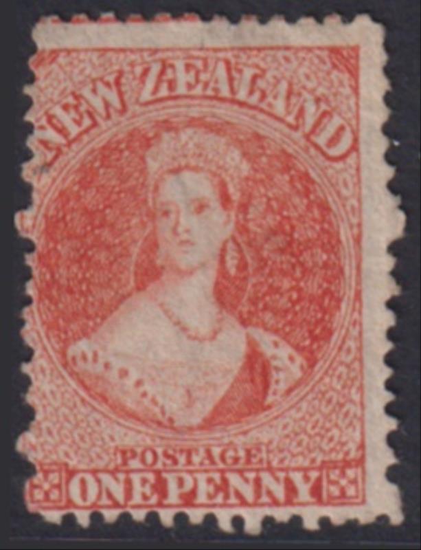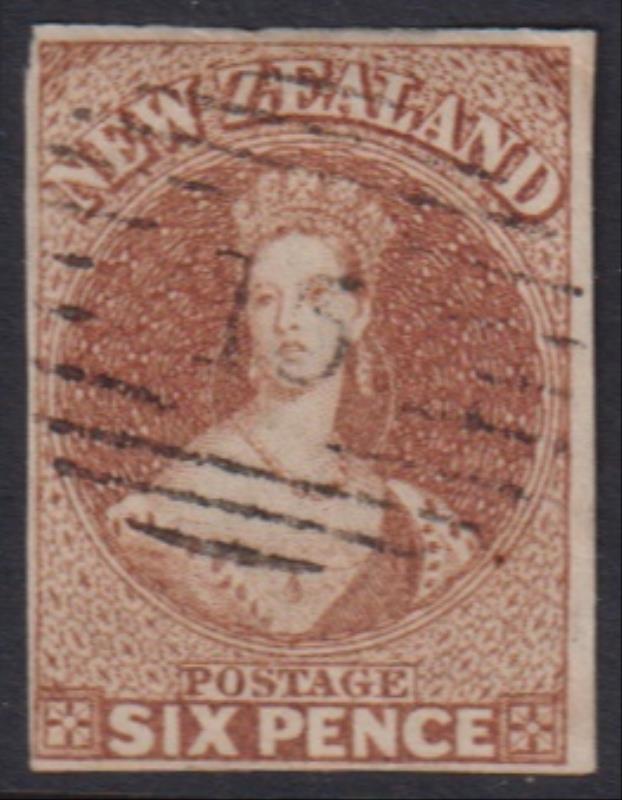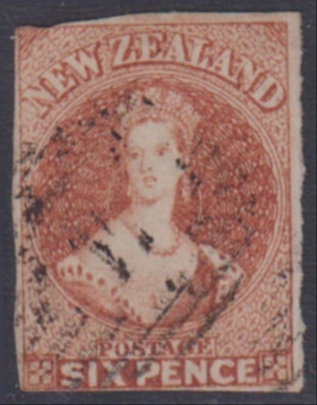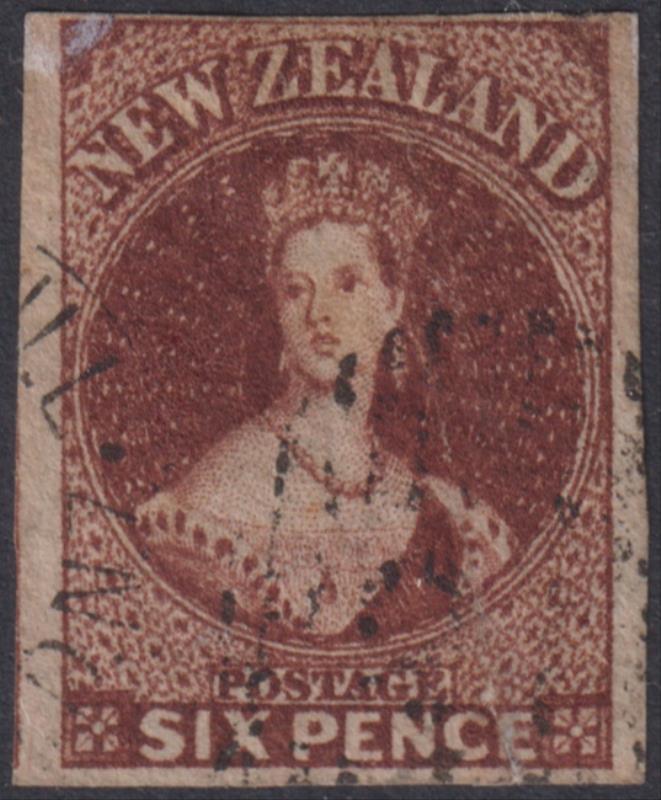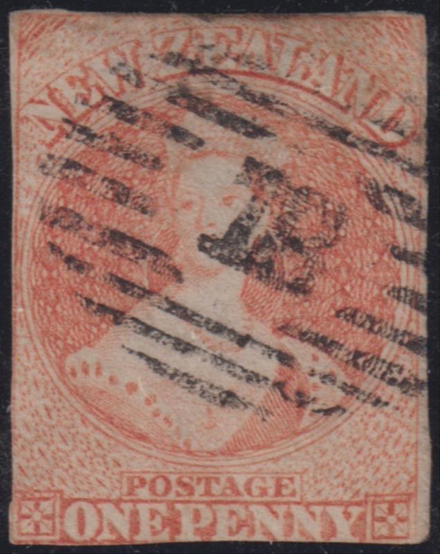 FFQ Chalon 1d dull orange, no wmk, horiz mesh, imperf about 2 margins. Almost complete "18" obliterator (already worn) of Dunedin. Light stain on back along top edge. SG 8. Cat £900. GU. (Image)