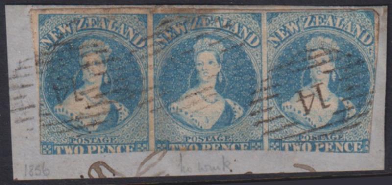 FFQ Chalon 2d blue horiz strip of 3 on small piece, cut into at base & R/H side, no wmk, light staining, fine barred "14" cancels "RPSNZ handbook type "14B", therefore Picton use (or maybe Nelson). SG 10. Cat £540. (Image)