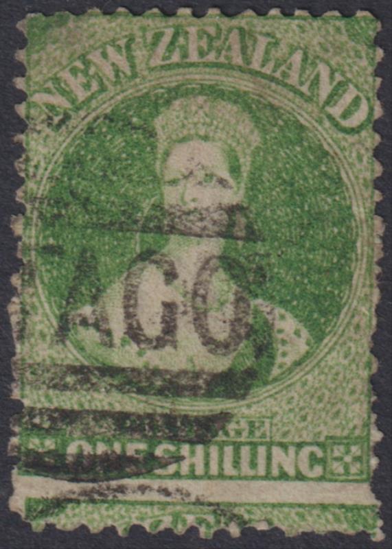 FFQ Chalon 1/- green, NZ wmk, p13 with c4mm of lower stamp included. Thin top left corner, barred "Otago" cancel. SG 106. Cat £1000. GU/FU. (Image)