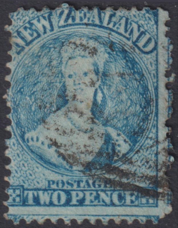 FFQ Chalon 2d pale blue (worn plate), p12½, NZ wmk, o/c, light barred canc. SG 107. Cat £100. FU. (Image)