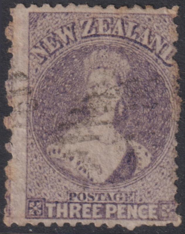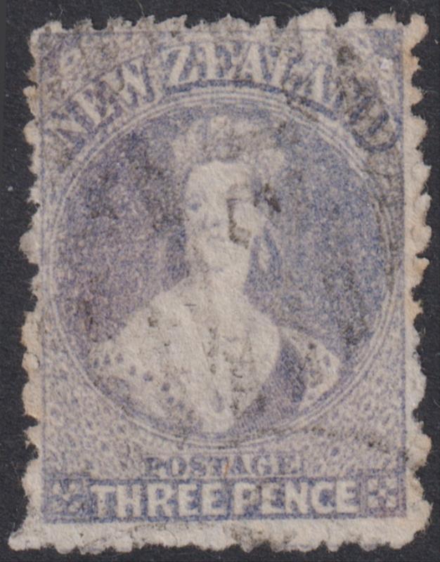 FFQ Chalon 3d lilac, p12½, star wmk, clear "C/21" barred obliterator cancel of Hokitika. SG 117. Cat £45. GU/FU.