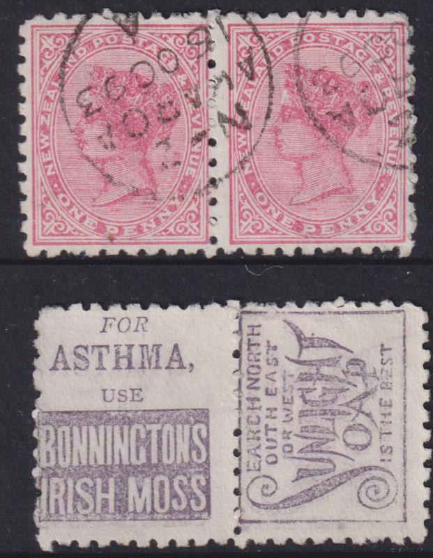 1893 1d SSF advts For & Search North horiz pair, p10, 2nd setting in mauve (positions 146 & 147), Akaroa 16 OC 93 "A" class cds. FU. (Image)