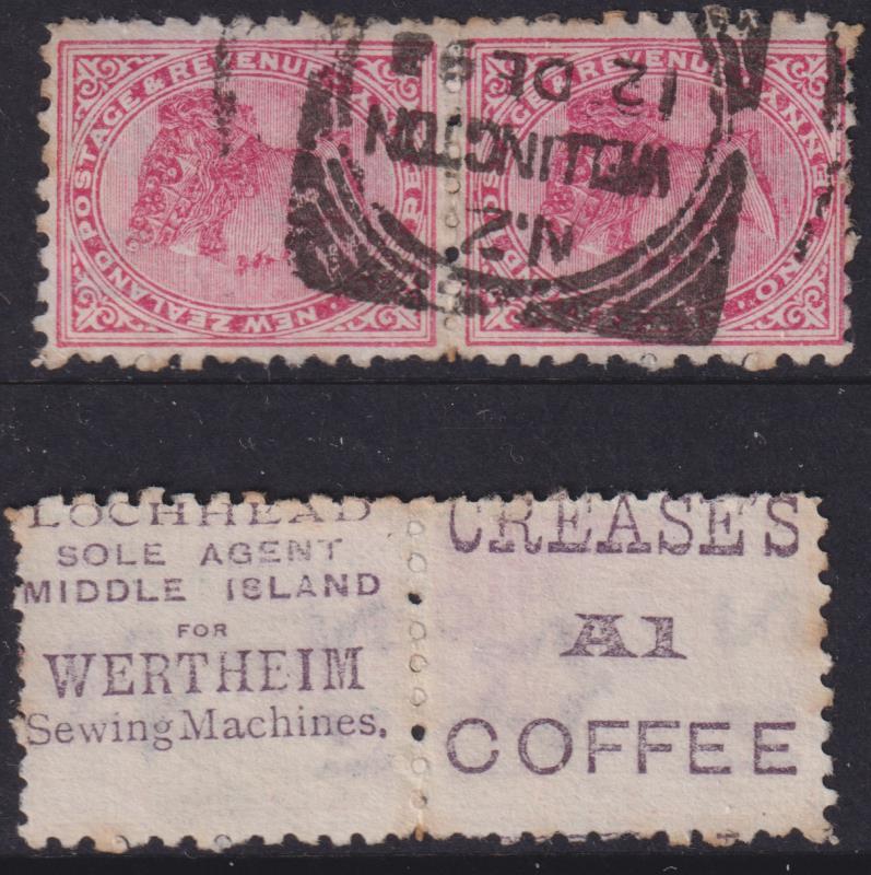 1893 1d SSF vert pair, p10 mauve advts Crease's & Lochhead, 2nd setting (positions 127 & 139), Wellington 12 DE 93 "F" class cancel. GU. (Image)